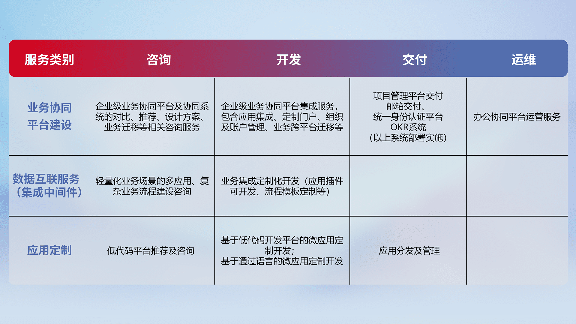 针对钉钉、、企微、、、、IDaas等平台级产品提供产品的规划、、、、方案、、、、交付、、定制化开发等服务,,,,实现如统一协同办公、、智能客户服务、、、、混合会议管理、、、、智能数据查询、、、等业务场景,,,,实现数字化转型。。。。