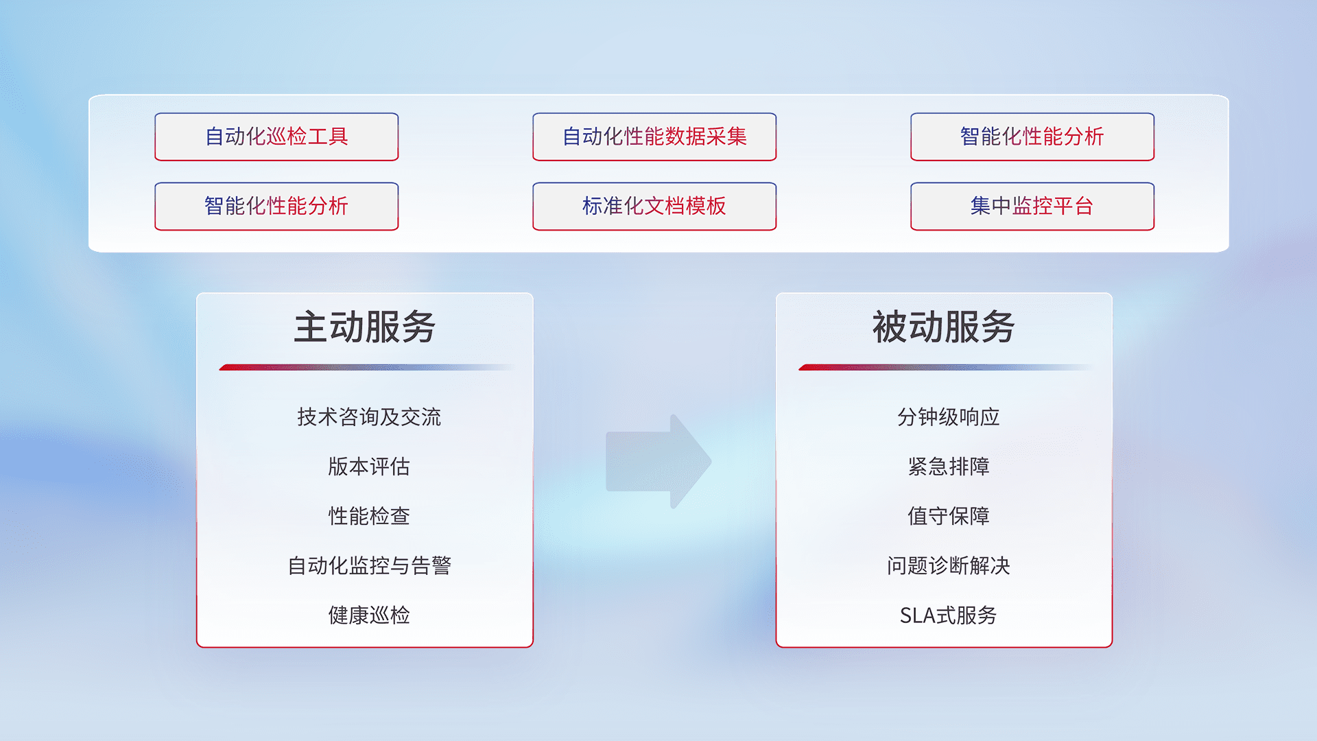 智能化工具和标准化文档,,,,保障服务质量,,提供主动服务(包含技术咨询、、、版本评估、、性能检查、、自动化监控与告警、、、健康巡检)和被动服务包含(分钟级响应、、、紧急排障、、值守保障、、、、问题诊断解决、、、SLA服务)。。。