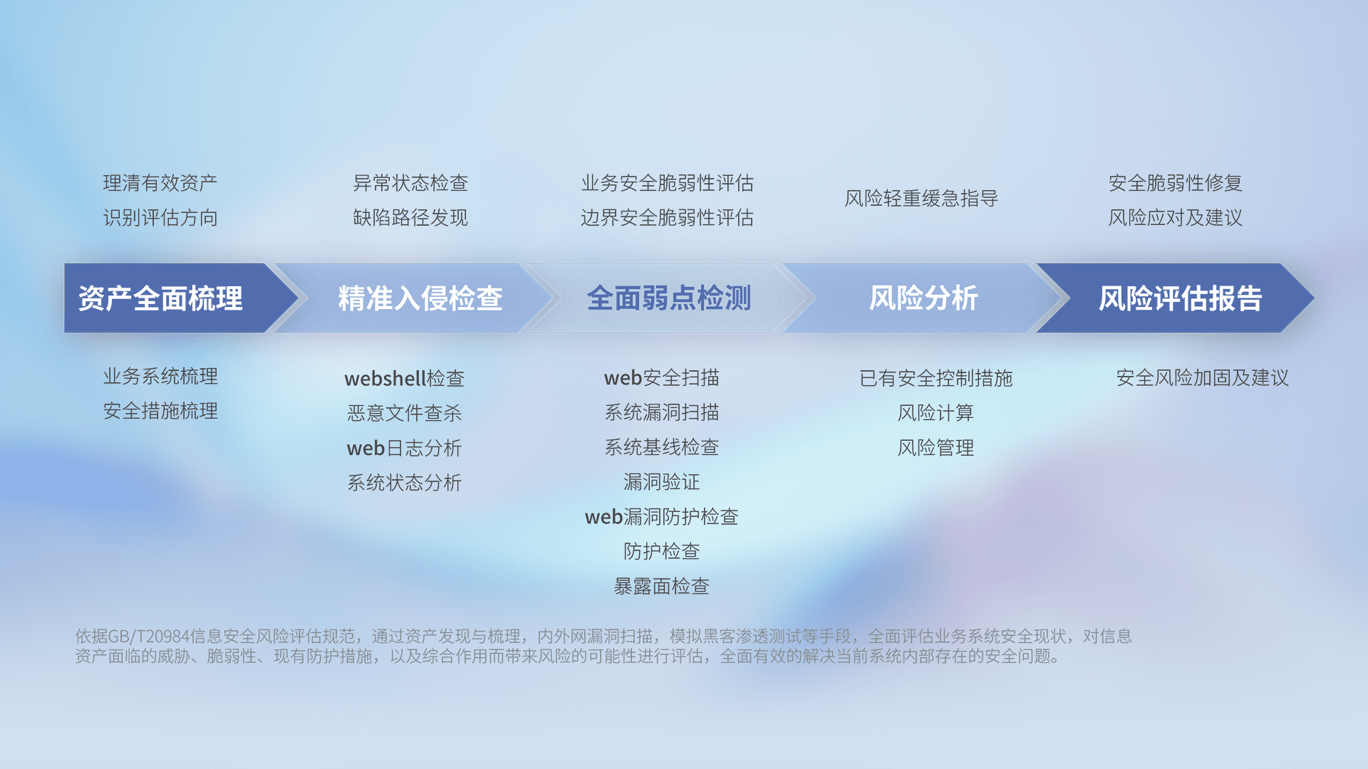 针对客户行业特性,,,,以专业的安全服务+多厂商联合解决方案提供专属的一站式安全管理服务,,,,帮助客户全面感知网络空间威胁,,基于识别、、检测、、、分析、、防护、、监测、、、、响应的服务理论模型,,,,从方案咨询、、集成交付、、评估验证、、优化加固、、运维运营,,,致力于为客户提供完整的闭环管理式安全服务。。。以实战经验为客户打造高抵御风险的安全体系,,帮助客户发现威胁、、、、对抗威胁、、、、处置威胁,,不断积累安全对抗能力,,,,持续保障数字化安全。。。。